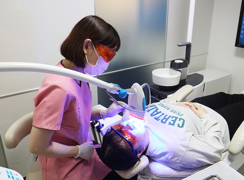 歯ぐきに保護剤を湿布してから歯の表面にホワイトニング剤を塗ります。光を照射した後、薬剤を除去します。仕上げに歯をコーティングするトリートメントを行う場合もあります。