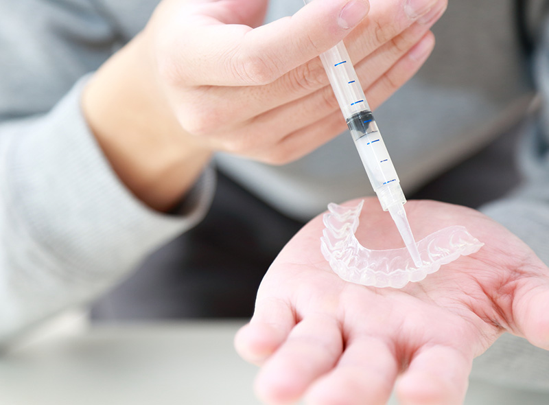 ご自宅で自分のペースで進められるホワイトニング方法です。患者さん専用のマウスピースを作製し、薬剤を注入して毎日一定時間装着します。時間をかけて徐々に白くしていくため、自然な仕上がりになります。通院回数を抑えたい方に適しています。